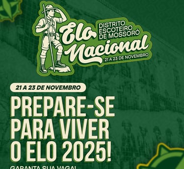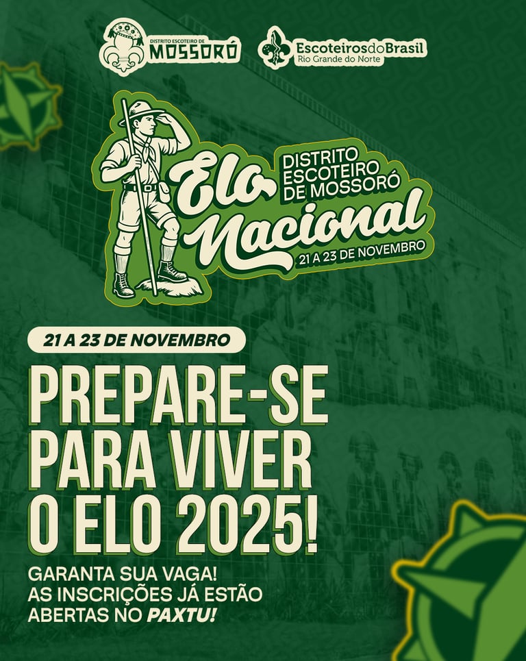 No Distrito Escoteiro de Mossoró, o ELO 2025 acontece de 21 a 23 de novembro, em Mossoró/RN, reunindo jovens em uma experiência única de aprendizado, amizade e aventura.